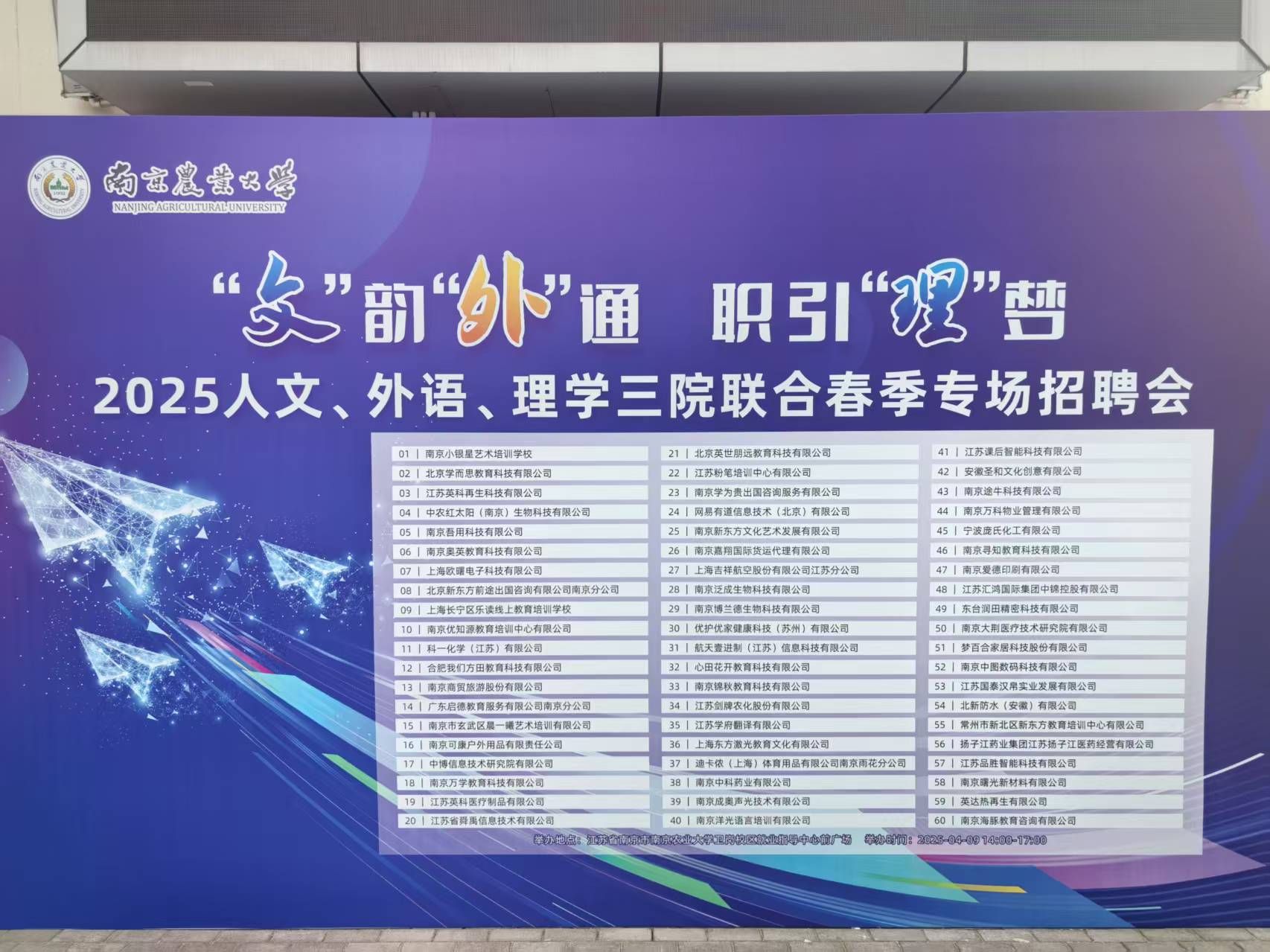 为贯彻落实党中央、国务院关于高校毕业生就业工作的决策部署,促进买球体育官网毕业生高质量就业,买球体育官方网站、外语学院、人文学院于2025年4月9日在买球体育官方网站卫岗校区联合举办了“‘文’韵‘外’通,职引‘理’梦”专场招聘会。
