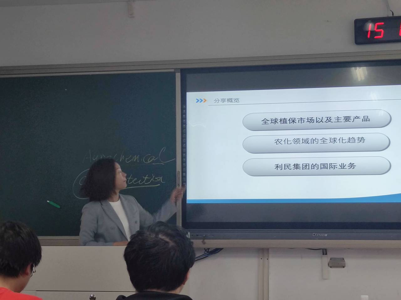 在全球化农业市场概览环节,李媛媛详细介绍了全球植保市场的规模和发展趋势以及主要产品。她重点介绍了除草剂、杀虫剂和杀菌剂等农化产品的应用和市场需求,以及利民集团在该领域的主要产品和技术。她还分享了农化领域的全球化趋势,以及利民集团在全球范围内的业务布局和发展战略。她还向同学们展示了利民集团在农化领域的全球化趋势和业务布局,让同学们对农化行业的发展有了更深入的了解。