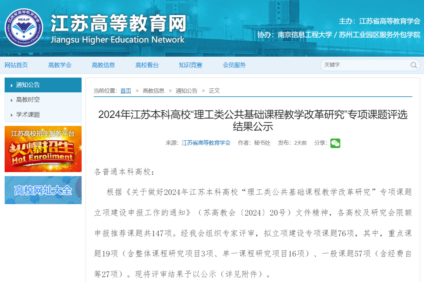 2024年7月,江苏省高等教育学会公布了2024年江苏本科高校“理工类公共基础课程教学改革研究”专项课题评选结果。买球体育官网张瑾老师、杨涛老师主持申报的课题《心中有“数”的秾味思政——新农科背景下大学数学课程与课程思政建设》获批重点课题(单一课程研究项目)立项。