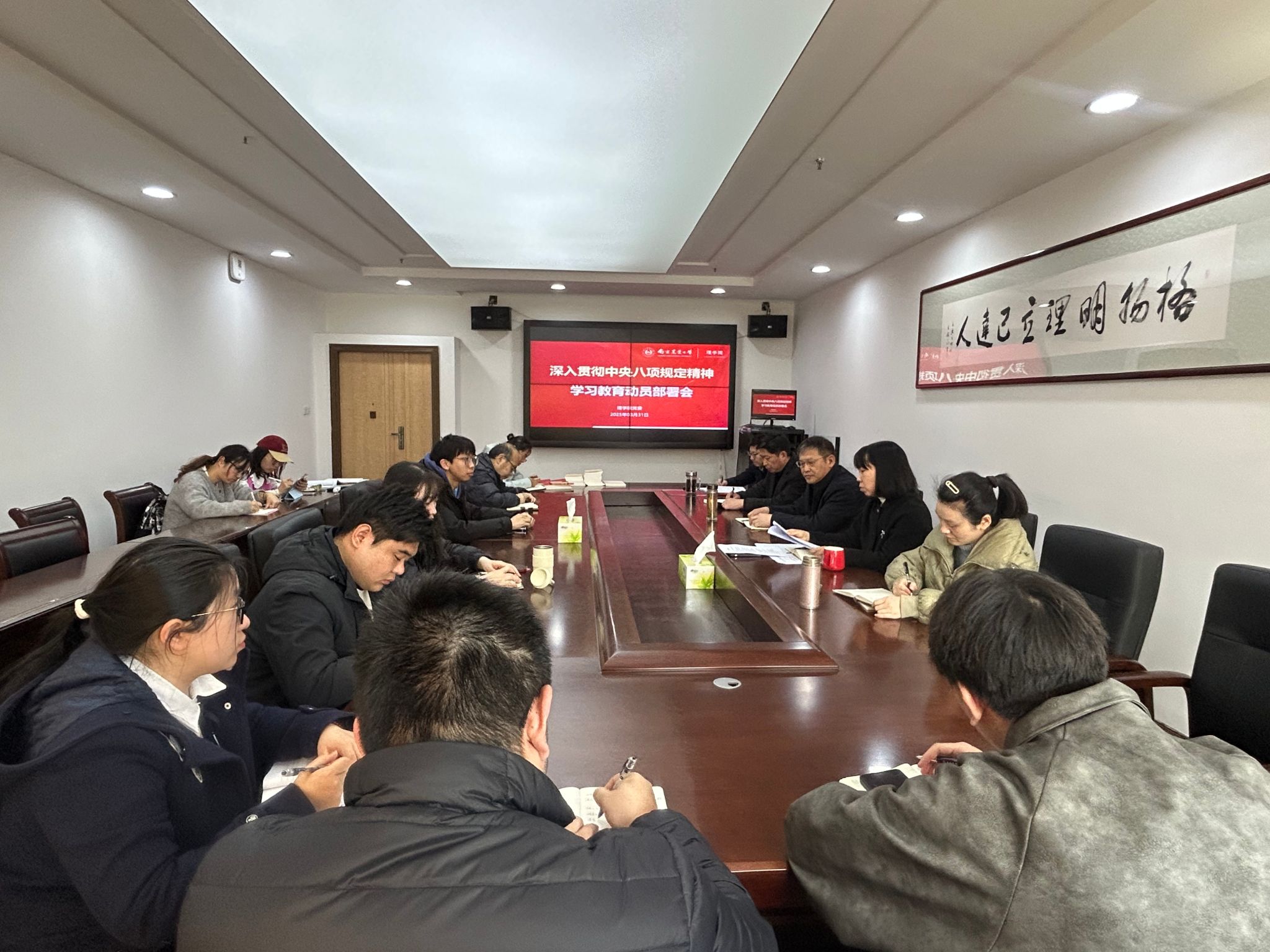 吴彦宁传达了学校2025年全面从严治党工作会议暨巡视整改动员部署会会议精神和《中共买球体育官方网站委员会关于开展深入贯彻中央八项规定精神学习教育的实施方案》精神,重点领学了校党委书记王春春的大会讲话精神,集体研学了《关于改进工作作风、密切联系群众的八项规定》原文。