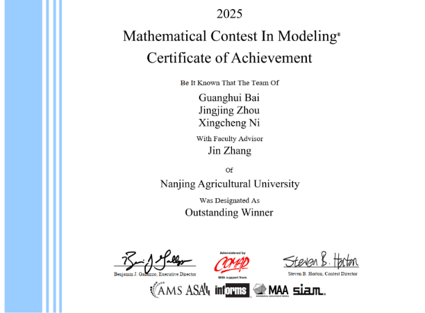 近日,2025年美国大学生数学建模竞赛(MCM/ICM)成绩揭晓,买球体育官方网站统计学专业2022级本科生白广慧、周晶晶和倪兴程组成的参赛队伍在全球2.7万支队伍中脱颖而出,摘得最高荣誉——Outstanding Winner奖(特等奖),彰显了买球体育官网本科生创新实践能力与综合素质的国际一流水平。