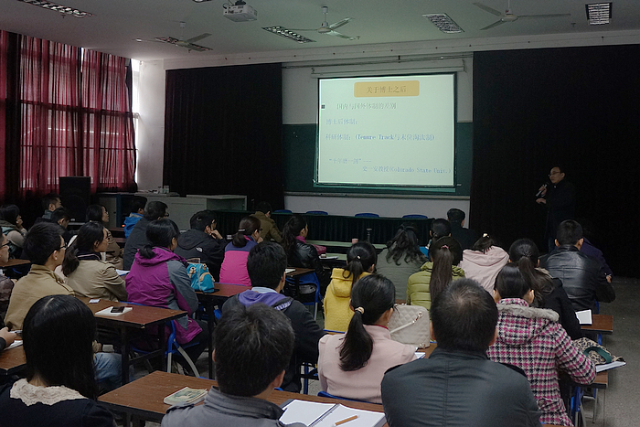 吴磊教授以“点滴心得/他山之石---科研十年感悟”为题为理学论坛拉开了序幕。结合在中国科学院攻读博士,以及先后在美国Syracuse University和University of Notre Dame从事博士后研究期间的科研和学习经历,吴磊教授与大家真诚的分享了每一位导师的悉心指导及自己对科研的点滴心得,并就科研论文写作、实验室管理及教学中的基本科学问题对科研工作的促升等广大研究生和青年教师最关注的问题深入交流了自己的观点和经验。在精彩的报告结束之后,吴磊教授还在和与会师生的互动交流中探讨了博士后导师的选择,以及如何结合自身兴趣及教育和学术经历提炼出自己的科研方向等问题。