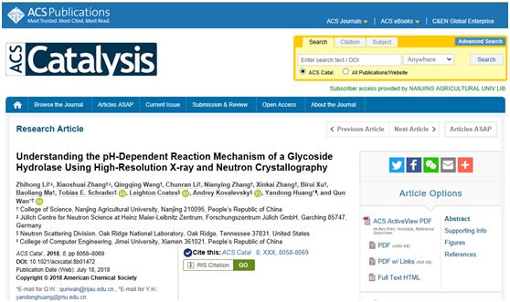 买球体育官方网站万群教授团队近日在ACS Catalysis发表了研究论文“Understanding the pH-Dependent Reaction Mechanism of a Glycoside Hydrolase Using High-Resolution X-ray and Neutron Crystallography”(影响因子11.384)。买球体育官方网站为第一完成单位,买球体育官方网站万群教授为第一通讯作者,集美大学黄艳东老师为共同通讯作者,买球体育官方网站博士生李治宏为第一作者,研究生张晓帅为共同第一作者。该论文在原子水平揭示了糖苷水解酶的活性受到不同酸碱度调节的机理。