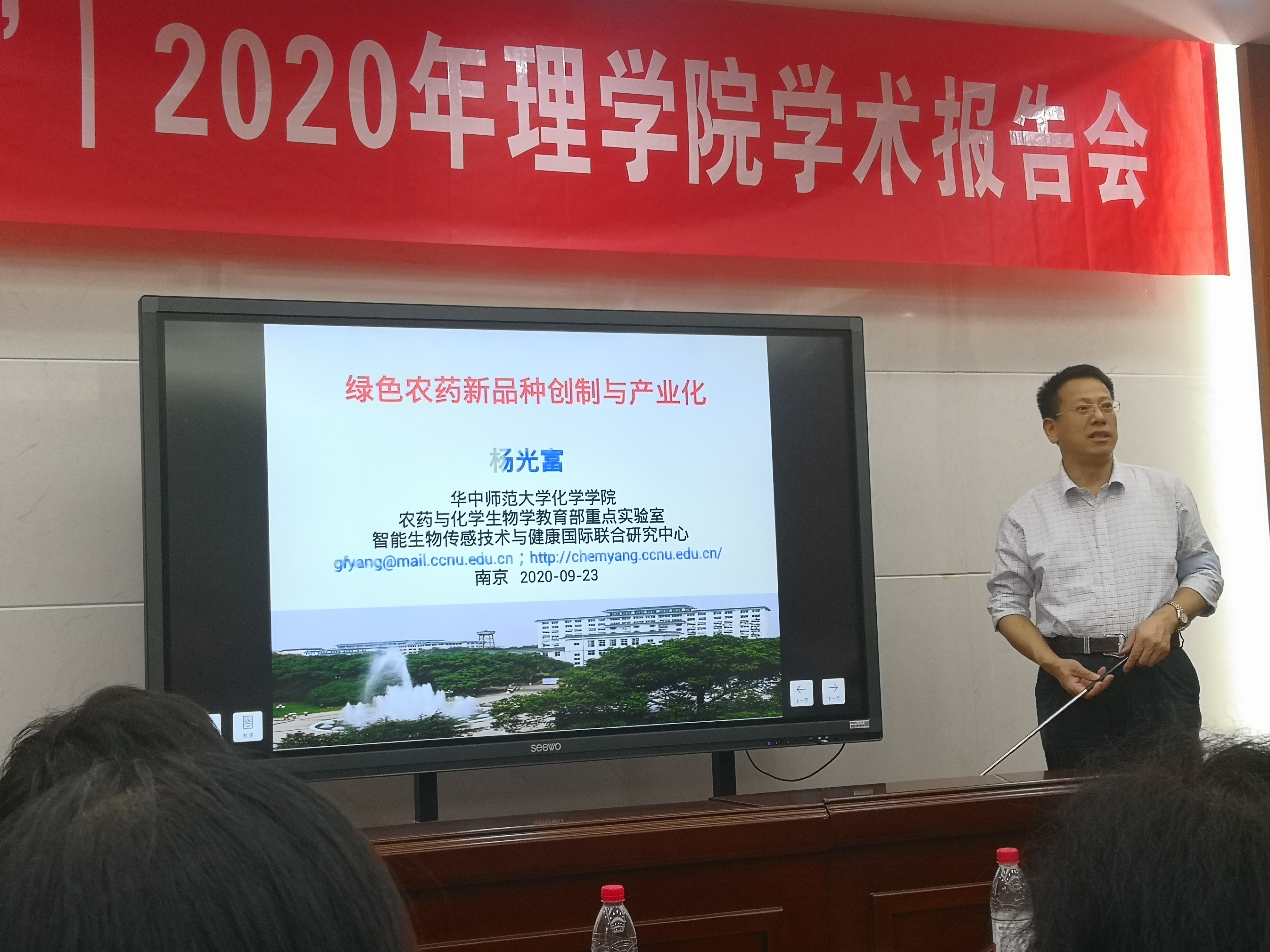 2020年9月23日下午,华中师范大学国家杰出青年科学基金获得者杨光富教授来访买球体育官方网站,并做了题为“绿色农药新品种创制及产业化”的精彩报告。报告由买球体育官方网站副院长吴磊教授主持,校内买球体育官方网站、植保学院、生科院等200多名师生参加了报告会。杨光富教授首先介绍了农药创制的过程和农药创制面临的挑战,接下来介绍了课题组为解决这些问题开展的研究工作,开发了基于活性小分子与作用靶标相互作用研究的生物合理设计创新研究体系,发展了药效团链接碎片虚拟筛选、计算突变扫描等分子设计新方法,成功创制出喹草酮、吡唑喹草酯、氟苯醚酰胺、双氟醚菌胺和醚唑磺胺酯等多个农药候选新品种以及抗肿瘤活性候选化合物。报告内容精彩纷呈,现场气氛热烈,报告过程多次被掌声打断。报告后,杨光富教授与现场师生进行了热烈的交流和讨论,详细耐心地解答了师生们提出的问题,并与部分师生亲切合影。