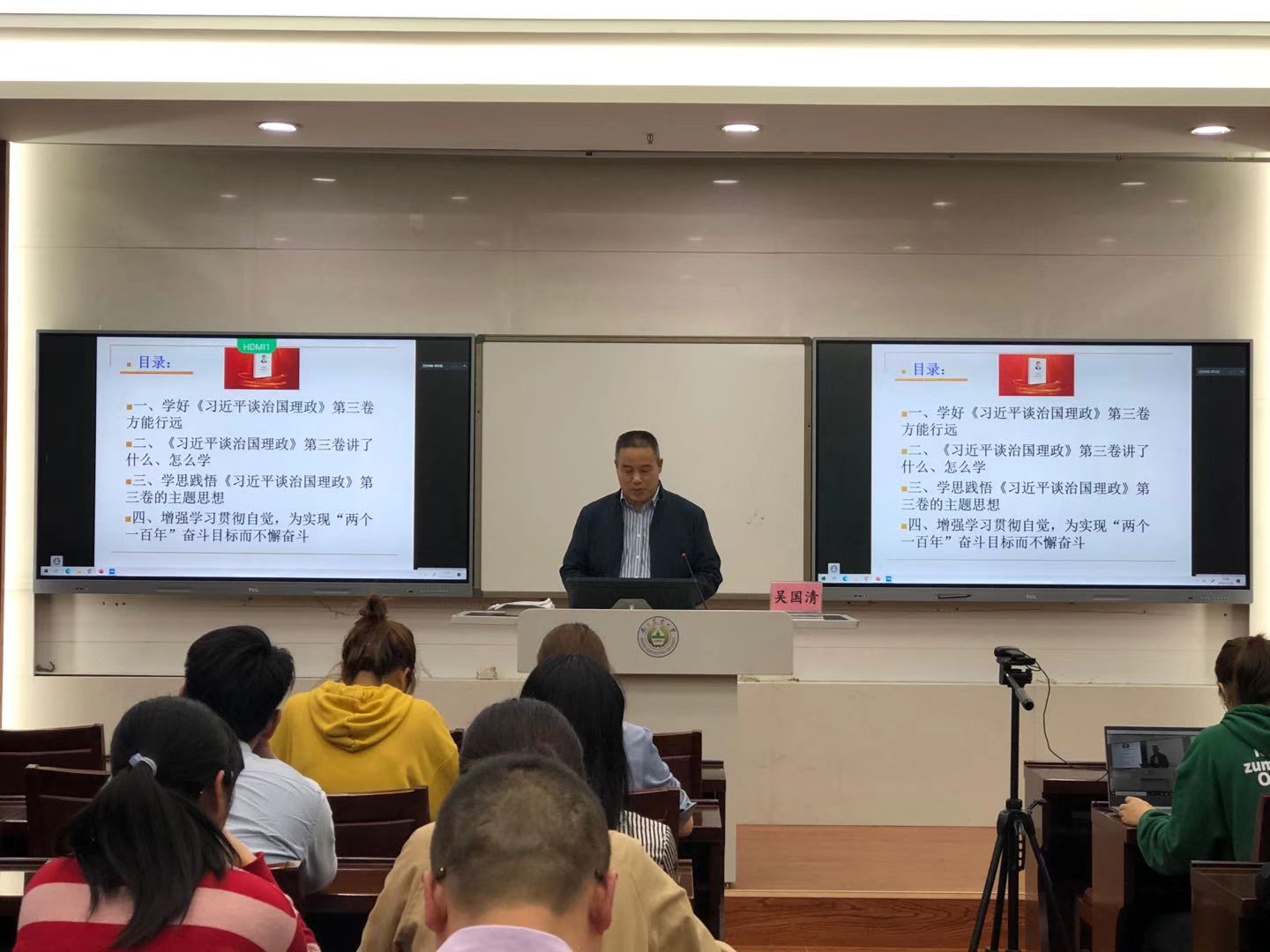 本次学习会,由马克思主义学院吴国清教授以“站在新的历史起点上学思践悟习近平治国理政思想”为题,为我们系统阐述《习近平谈治国理政》(第三卷)主要内容,以及学习方法,揭示了“学好《习近平谈治国理政》方能远行”的真理,鼓励全体党员增强自觉学习意识,为实现“两个一百年”奋斗目标而不懈奋斗。