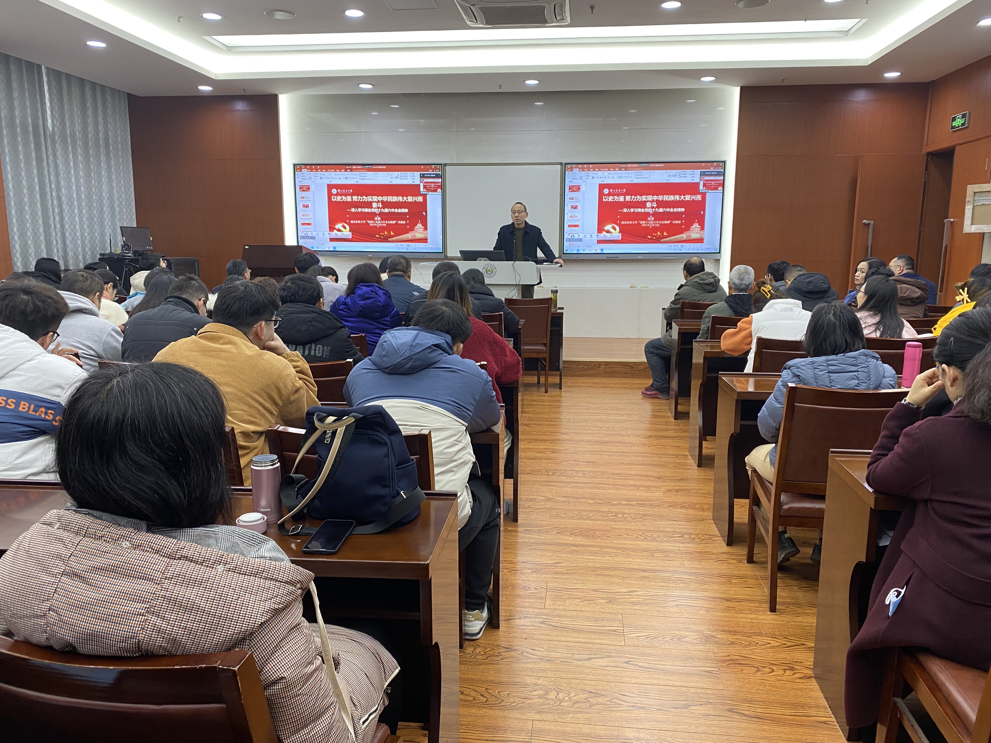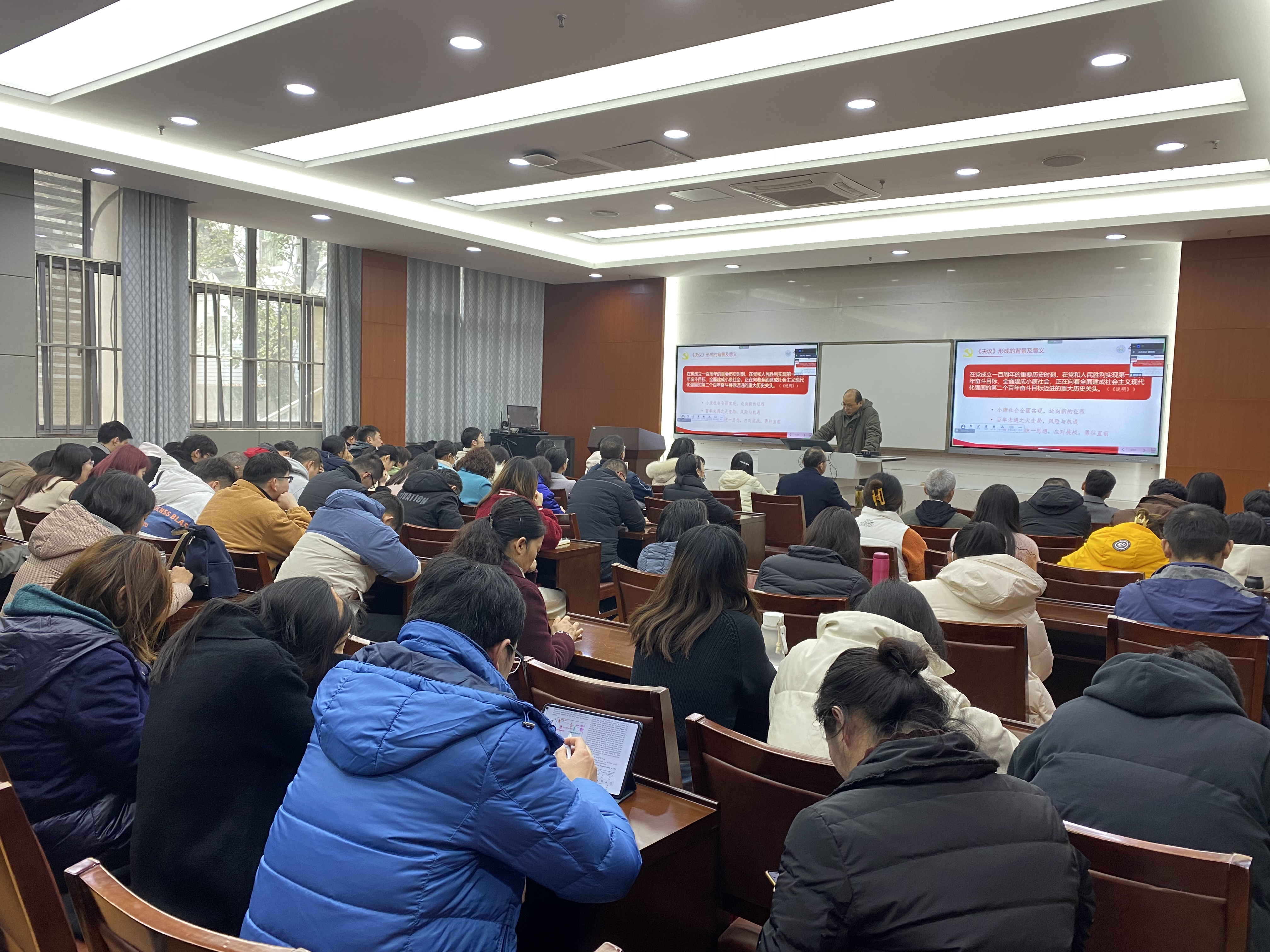 刘俊老师从《中共中央关于党的百年奋斗重大成就和历史经验的决议》形成的时间坐标,百年奋进征程和宝贵经验积淀等三方面对党的十九届六中全会精神进行了生动的解读。他结合中国共产党百年奋斗历程,阐释了马克思主义中国化的历程,解读了中国共产党百年奋斗的历史意义和历史经验,使大家进一步理解了中国共产党的初心和使命,理解了“中国共产党为什么能”,只有党才能领导中国人民从一个胜利走向另一个胜利,也必将领导中国人民走向社会主义现代化强国的伟大胜利。