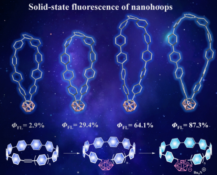 近日,买球体育官网化学系李翔副教授课题组的最新研究成果“Boron-Cluster Embedded Necklace-Shaped Nanohoops”在化学领域顶级期刊《Angewandte Chemie International Edition》(中文译名《德国应用化学》,影响因子:16.823)发表。该成果首次合成了碳硼烷嵌入的项链型CPPs纳米分子大环,由于碳硼烷分子独特的脱硼化反应,简单易得的制备了少见的离子型的CPP化合物,nido-car功能化的这类CPPs化合物具有高效溶液荧光发射性质,其溶液量子效率达到了90%,且具有高的固态量子效率(87.3%),为进一步实现CPPs类化合物的生物成像应用提供了新的选择。
