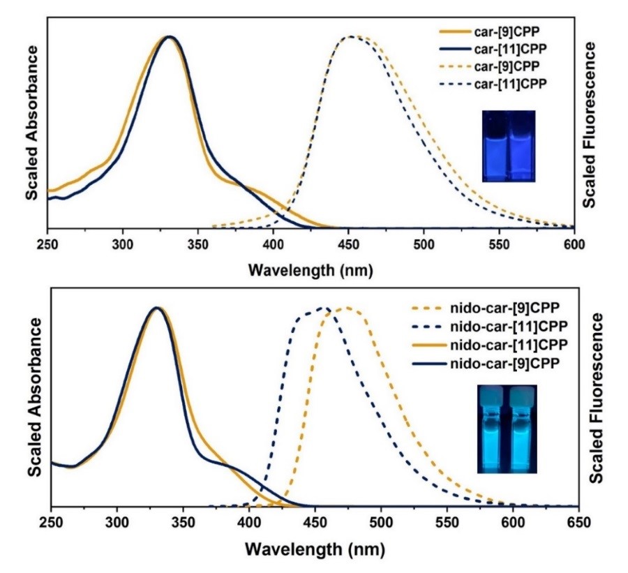 通过设计合成,我们证明了大环的炔烃插入是可以直接形成碳硼烷嵌入的CPP环。同时,我们设计合成了二个不同尺寸的大环,便于研究尺寸的影响。由于碳硼烷在强碱性存在的条件下,可以发生脱硼化反应,得到掉顶的盐结构。邻碳硼烷的引入基本保持了CPPs母环类似物的溶液光物理性质,然而其固态发光量子强度明显增强,当碳硼烷转化为掉顶结构后,其溶液和固态发光强度均明显增强,尤其是化合物nido-car-11CPP,其溶液量子产率达到了90%,同时保持0.8的固态量子产率,这应该是目前报道的CPPs类似物发光最亮的化合物,有望进一步应用到分子成像和固态发光材料领域中!