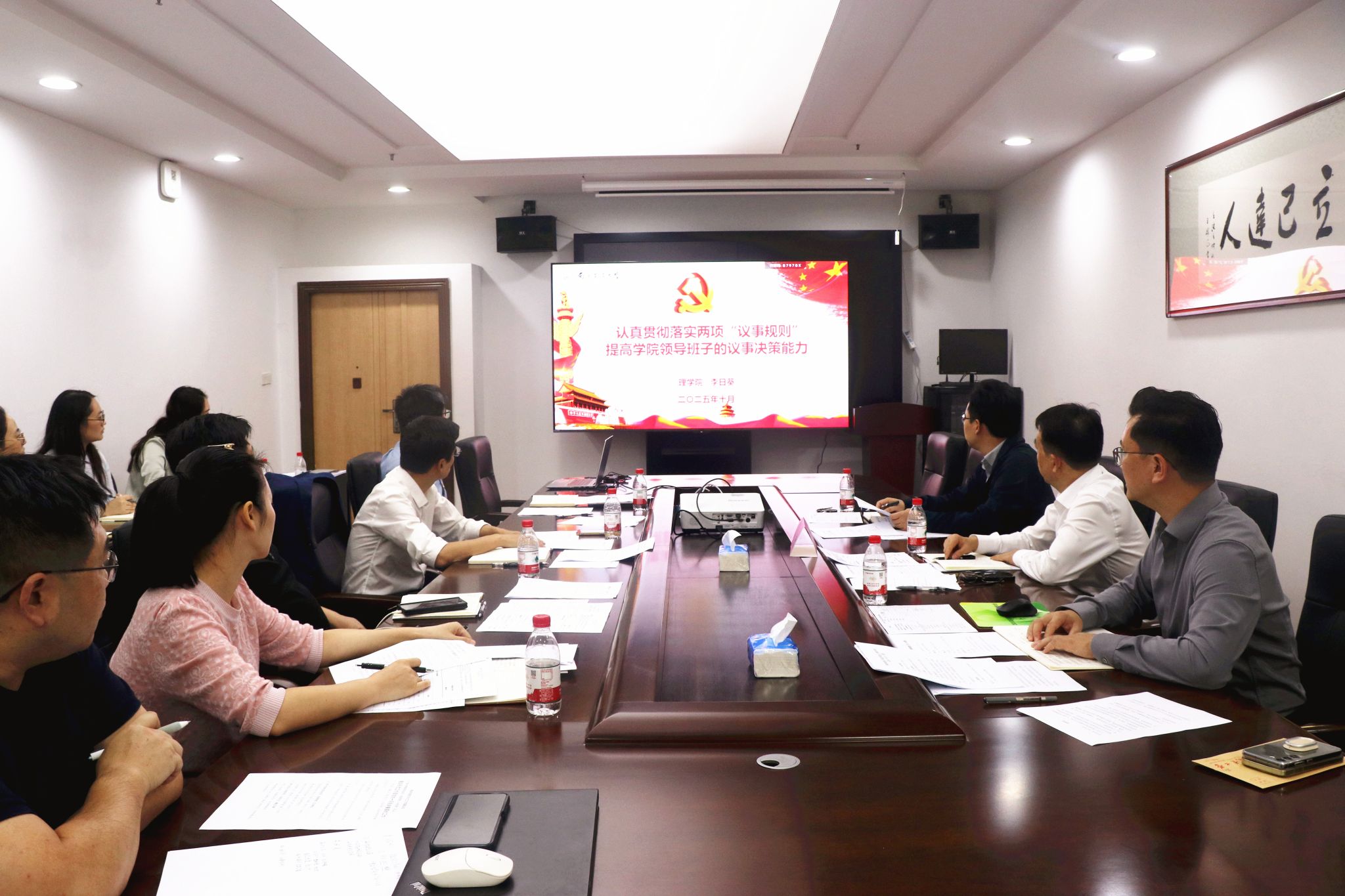 党委理论学习中心组就《认真贯彻落实两项“议事规则”提高学院领导班子的议事决策能力》开展专题理论学习,进一步明确两类会议的职能边界与运行机制,会议要求全体班子成员严格执行“会前充分酝酿、会上民主集中、会后跟踪落实”流程,坚决落实“一把手末位表态”等制度,形成“党委领导、党政协同”的工作格局,确保学院各项工作决策过程规范、结果科学。