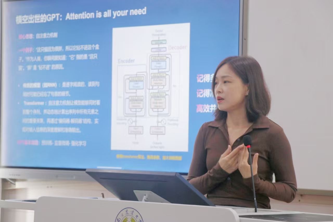 信息化建设中心综合规划部副主任王露阳以《AI—第四类杠杆,撬动高等教育范式革命》为题,系统阐述了人工智能技术的底层逻辑及其在教育领域的深度融合。她借助具体案例,详尽展示了课程设计智能化、课件开发高效化、文献检索精准化、数据分析可视化等典型案例,并着重指出“提示词工程”对于提升AI使用效能的关键意义。