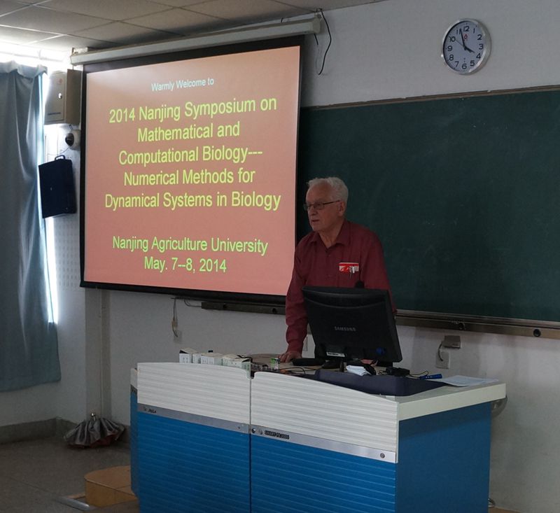 第二届数学生物学与计算生物学国际学术报告会(ISMCB2014)于2014年5月7--8日在买球体育官方网站召开。会议的中心议题是“生物学动力系统的数值方法”。由买球体育官方网站游雄教授主持,买球体育官方网站院长章维华教授致欢迎词,吴磊副院长到会欢迎。应邀报告专家有新西兰皇家科学院院士、新西兰奥克兰大学 John Butcher教授,西班牙皇家科学院院士、巴利亚多德利大学Jesús María Sanz-Serna教授,英国剑桥大学Arieh Iserles教授、德国卡尔斯鲁厄理工学院Tobias Jahnke教授,华中科技大学黄乘明教授,中南大学甘四清教授、湘潭大学肖爱国教授等。报告内容为稳定保守问题的G-辛一般线性方法、多尺度随机化学反应动力系统的混合方法、 高振荡系统的分裂方法、保能量方法、小波自适应网格方法、随机系统的monte Carlo模拟与平均方法、刚性随机系统的数值方法的收敛性与稳定性等。买球体育官方网站、农学院、资环学院、生命科学学院、园艺学院的40多名教师、研究生及本科生参加了报告会。报告专家详细解答了听众的提问,与部分青年教师和研究生分享了科研选题、科研方法、科研论撰写等方面的经验。