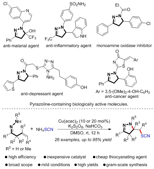 烯烃双官能团化反应能够从廉价易得的烯烃一步高效获得结构多样的有机化合物,具有原子经济性和步骤经济性。因此,烯烃的双官能团化是现代有机合成中强有力的合成策略。然而,未活化烯烃与活化烯烃相比,前者反应活性更低,反应选择性更难控制,因此,未活化烯烃的双官能团化反应更具有挑战性。吡唑啉杂环骨架存在于很多天然产物和除草剂、心血管保护剂等药物活性分子中,因此,吡唑啉杂环的合成方法研究具有重要意义。