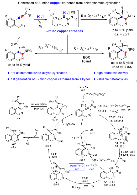 该工作报道了廉价金属Cu+催化炔酰胺叠氮化合物经过铜卡宾机理得到稠氮杂环化合物,该工作报道了第一例铜催化炔烃经过铜卡宾途径的反应。此外通过手性的双噁唑啉配体还实现该反应的不对称合成手性的稠氮杂环化合物。邓超课题组通过理论计算详细研究了该反应的反应机理和复杂的环化选择性,以及从理论上证明该反应经过铜卡宾的反应历程。