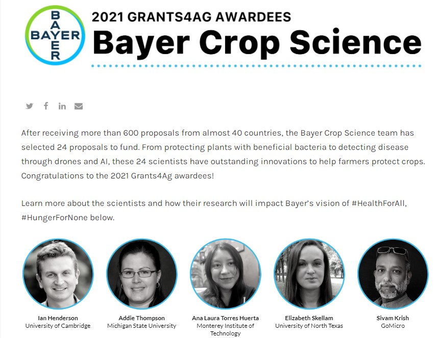 拜耳公司Grants4Ag Award:https://www.halo.science/blog/bayer-crop-science-2021-grants4ag-awardees/