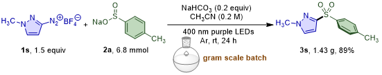 作者探寻了该磺酰化反应成规模化应用于工业生产的可能性。之前已有文献报道过以四步反应,总收率低于10%的方法得到吡唑芳基砜化合物3s(Eur. J. Med. Chem.,2009,44, 2313)。与之相比,作者使用6.8 mmol对甲苯亚磺酸钠2a与1-甲基吡唑重氮盐1s在标准反应条件下反应24 h,最终可生成1.43 g吡唑芳基砜化合物3s,收率达到89%。由于该反应具有条件更加温和、底物范围广泛、无过渡金属、无催化剂和无氧化剂的特性,因此这种EDA复合物介导的磺酰化反应将成为制药工业中一个有吸引力的方法。