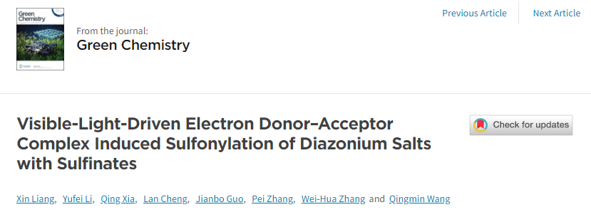 近日,绿色和可持续科技领域的国际权威期刊Green Chemistry在线发表了买球体育官方网站章维华、夏青团队完成的题为“Visible-Light-Driven Electron Donor–Acceptor Complex Induced Sulfonylation of Diazonium Salts with Sulfinates”的研究论文。该研究发展了可见光促进EDA复合物(electron donor–acceptor complex)引发的亚磺酸钠与芳基重氮盐的磺酰化反应,成功实现了芳基砜类化合物的绿色、经济、便捷的构建方法。
