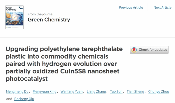 近日,买球体育官方网站邱博诚教授团队在国际著名学术期刊Green Chemistry上在线发表了题“Upgrading polyethylene terephthalate plastic into commodity chemicals paired with hydrogen evolution over partially oxidized CuIn5S8 nanosheet photocatalyst”的最新研究成果。