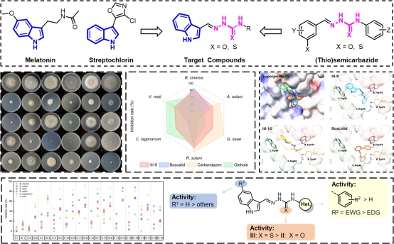 研究团队从褪黑素结构出发,分别引入脲、氨基脲、氨基硫脲片段并测试抗菌活性,发现含有氨基硫脲结构的褪黑素衍生物表现出显著的抗菌活性。其中化合物III-9对测试的六种植物致病真菌表现出广谱的抑制活性,相较于褪黑素的抗菌活性提高了10倍以上,III-9对水稻纹枯病菌的抑制率达到87.2%,活体抗菌活性结果表明,III-9对黄瓜灰霉病菌、油菜菌核病菌和辣椒疫霉病菌有接近50%的抑制效果。此外,构效分析发现吲哚5号位取代基的存在,无论是推电子基还是吸电子基,均会使活性较低。