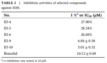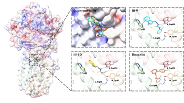 除此之外,团队还通过分子对接模拟和酶活实验对该系列化合物抗菌活性的作用机制进行了初步探索。以琥珀酸脱氢酶(SDH)为对接靶标,结果表明III-9,III-10与SDH结合情况优于对照药啶酰菌胺的结合情况,与抗菌活性结果一致。SDH的酶抑制活性实验结果也说明III-9,III-10优于啶酰菌胺,与分子对接结果和抗菌活性结果都保持了一致,这些发现为SDH作为这一系列化合物的潜在靶点提供了强有力的证据。研究团队还利用基于人工智能技术的在线预测平台对合成的化合物进行了类农药性预测,以指导后续的结构优化。