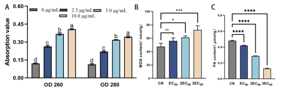 图2.化合物B1对水稻纹枯病菌细胞膜通透性、丙二醛、丙酮酸含量的影响
