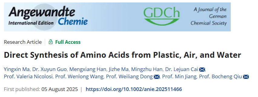 近日,买球体育官方网站邱博诚教授团队在化学化工类顶级期刊《Angewandte Chemie International Edition》在线发表题为“Direct Synthesis of Amino Acids from Plastic, Air, and Water”的研究论文。该研究首次实现了以废弃聚乳酸塑料(PLA)、空气和水为原料直接合成高值化学品丙氨酸。