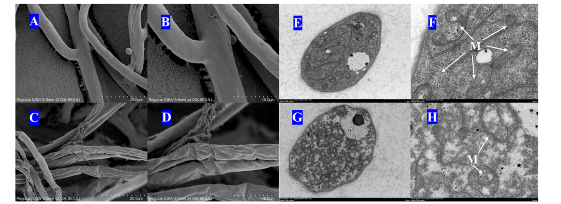 为进一步揭示其作用机制,研究团队开展一系列的机制验证实验。扫描电镜和透射电镜表明化合物C4能显著破坏细胞结构导致细胞内线粒体数目减少。细胞内容物渗漏的测定及PI染色表明化合物C4严重破坏了细胞膜的完整性,从而抑制菌丝生长。活性氧的检测显示细胞内活性氧含量升高,说明目标化合物的活性可能源于细胞内活性氧的积累。线粒体膜电位测定显示,C4化合物可显著降低水稻纹枯病菌线粒体膜电位,揭示其作用机制可能涉及诱导线粒体功能障碍,并通过体外SDH酶活实验验证了其靶标。