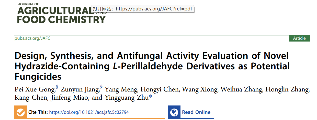 近日,买球体育官方网站朱映光教授团队以天然产物L-紫苏醛为骨架,设计合成了一系列新型L-紫苏醛衍生物,系统评估其抗植物病原真菌活性,并深入探讨其作用机制。相关研究以“Design, Synthesis, and Antifungal Activity Evaluation of Novel Hydrazide-Containing L‑Perillaldehyde Derivatives as Potential Fungicides”为题,发表于农业综合国际权威期刊《Journal of Agricultural and Food Chemistry》。