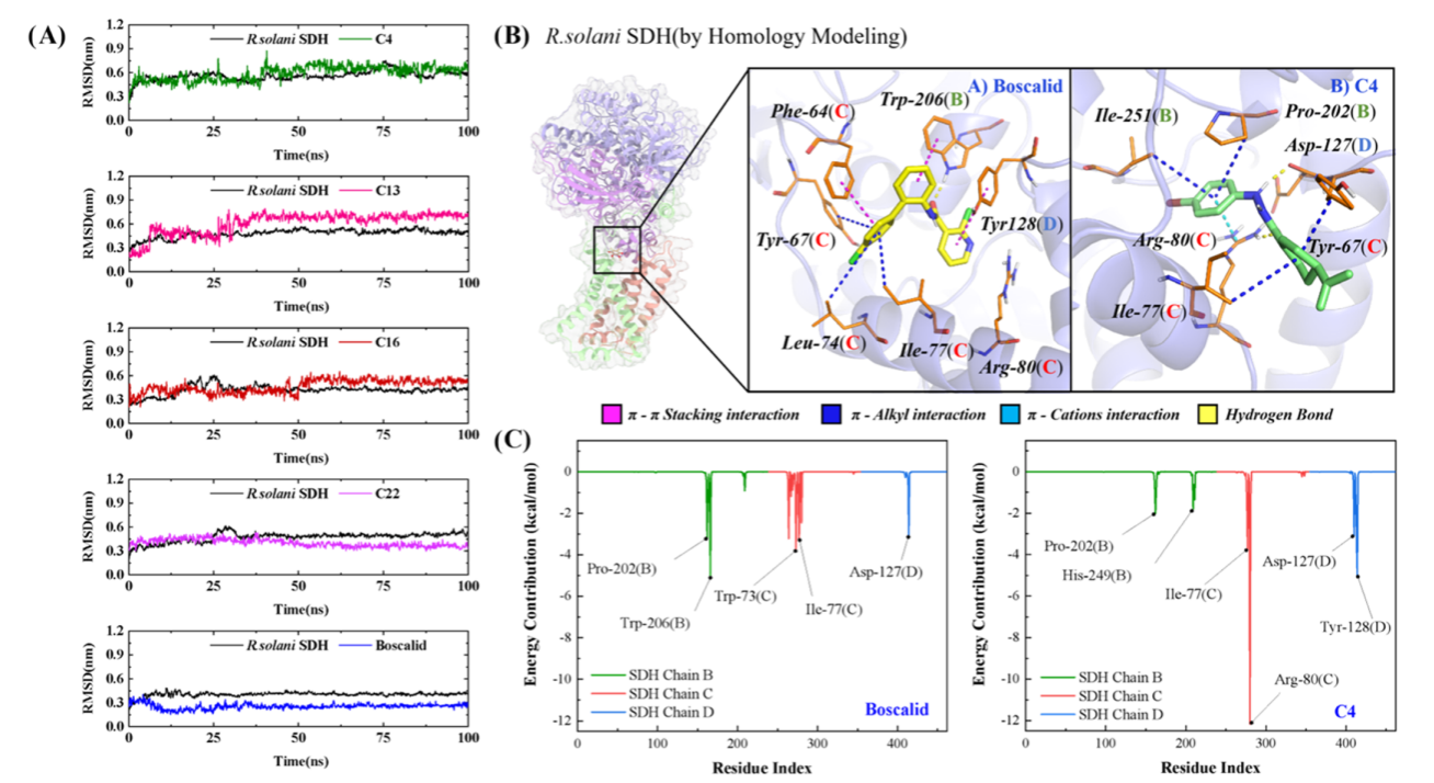 通过分子对接与分子动力学模拟进一步分析了活性小分子配体与靶标之间的动态稳定过程。结果显示,化合物C4与靶标蛋白琥珀酸脱氢酶稳定结合,结合能(-39.5 kcal/mol)比对照药啶酰菌胺(-31.4 kcal/mol)低。构象分析表明,C4和啶酰菌胺在相同的活性口袋内采用相似的构象与周围的氨基酸相互作用,验证了其作为琥珀酸脱氢酶类杀菌剂的潜力。