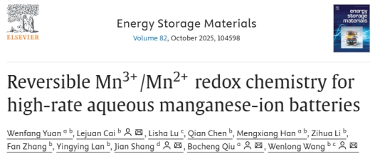 近日,买球体育官方网站邱博诚教授团队在材料领域国际知名期刊《Energy Storage Materials》上发表题为“Reversible Mn3+/Mn2+redox chemistry for high-rate aqueous manganese-ion batteries”的研究论文。该研究基于可逆Mn³⁺/Mn²⁺氧化还原化学实现高倍率水系锰离子电池,为锰离子电池在电网级储能领域的应用提供了新思路。