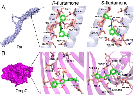 图3.不同构型呋草酮分子对细菌膜蛋白的分子对接模拟。