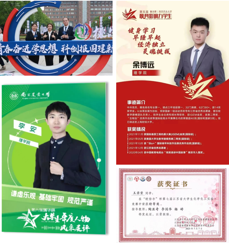 本年度,买球体育官方网站本科生余博远获评校第五届“瑞华杯”最具影响力学生、本科生李安获评校第六届“瑞华杯”最具影响力学生提名。“欧倍尔”杯第七届江苏省大学生化学化工实验竞赛中荣获特等奖、二等奖、三等奖,江苏省第十八届“挑战杯”大学生课外学术科技作品竞赛中获“恒星级”奖项,买球体育官网学生参与2023年国际基因工程机械设计大赛(IGEM)数模组获全球金奖。高等数学竞赛、美国大学生数学建模竞赛、化学化工实验竞赛等比赛中屡创佳绩,获20余项奖项。理院学子见贤思齐,树立远大目标,导引生涯发展提高标准,争取圆梦更高平台。