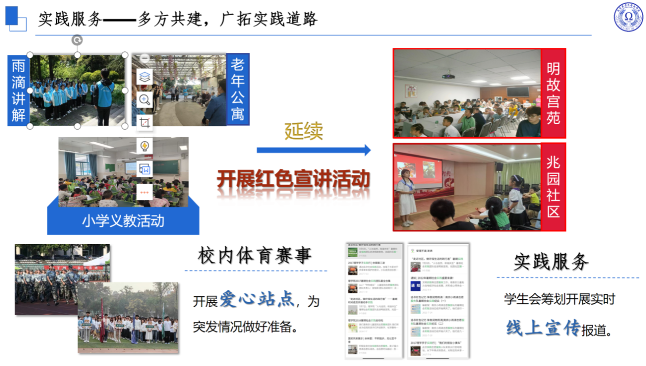 多方共建,广拓实践道路。买球体育官方网站学生会积极宣传本院同学先进志愿事迹、弘扬先锋青年。本年度在延续“小雨滴”志愿服务、美林老年公寓、小学义教的基础上,联合明故宫苑社区、兆园社区居委会开展红色文化宣讲活动。针对新生军训、运动会等校内体育赛事运动开展爱心站点,为突发情况做好准备。同时,学生会筹划开展实时线上宣传报导,展现新时代青年人敢于担当的责任感和爱国奉献的动人情怀,书写新时代青春答卷。