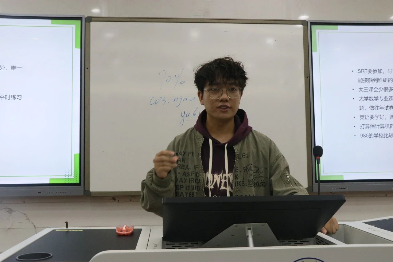 余林萱学姐结合自己的经历建议同学们要找到自己未来的方向。比如学姐自己选择了数学和生物交叉的方向,未来想做脑机交互游戏。只有对未来有明确的目标及规划,才能更有前进的动力,才能清楚自己需要什么,想做什么,走出属于自己的道路。