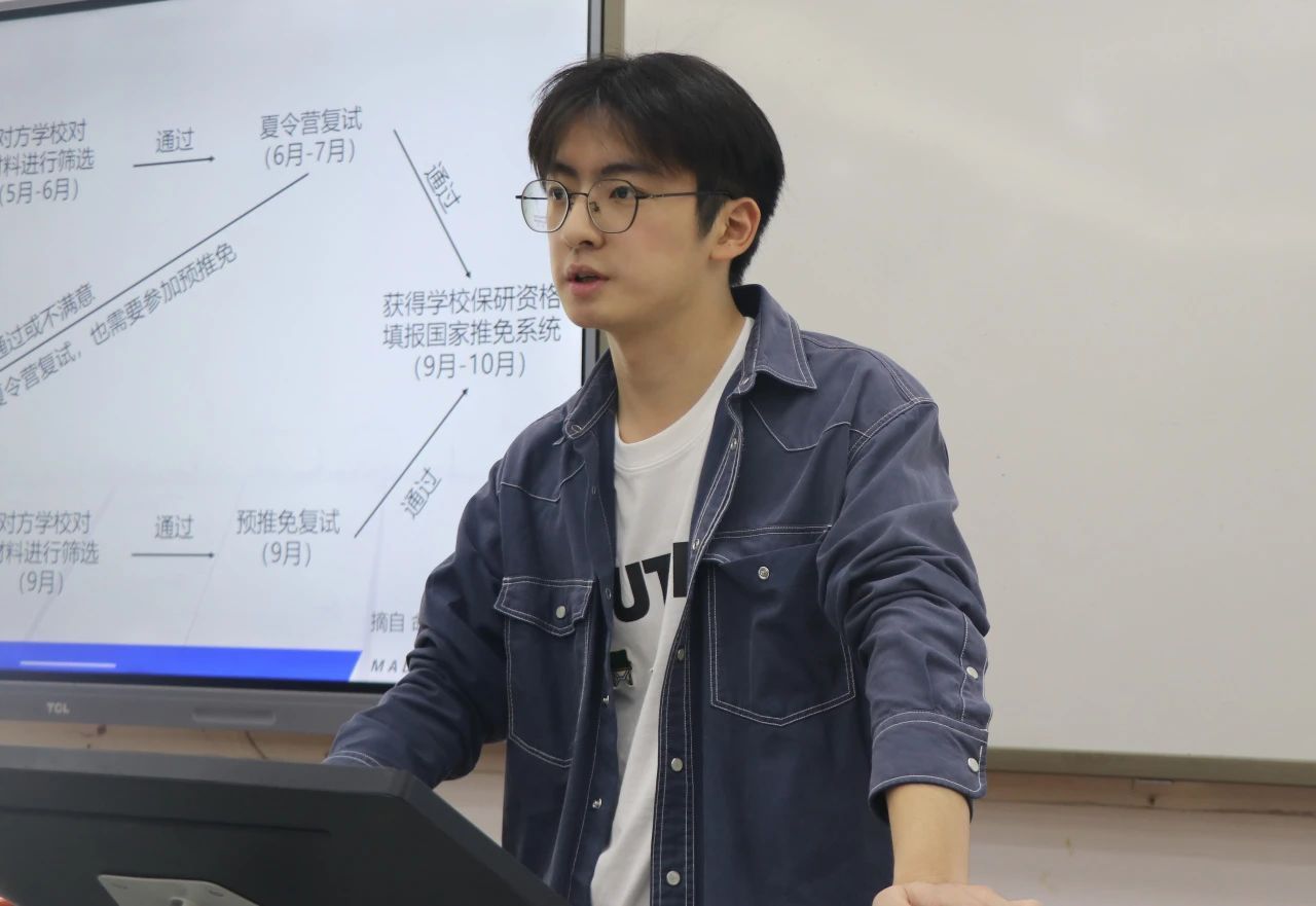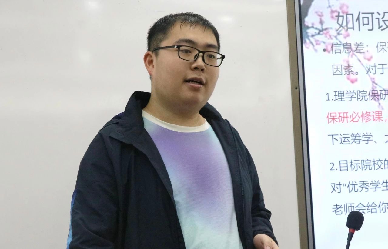 朱茂隆学长向大家简单介绍了自己的个人情况以及保研流程。他强调保研是一场旷日持久的战争,而绩点是保研的根本保证,学长还建议选择竞赛时应与自己未来发展方向相契合,养成科研素养,不要被局限、大胆探索,明晰保研意向。