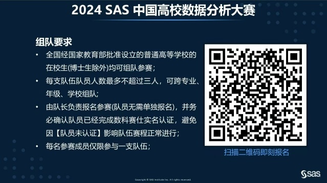 在 SAS 高校交流会中,同学们与行业专家进行深入交流,分享经验和见解,与此同时,他们也了解到了最新的数据分析趋势和应用案例,拓宽自己的视野。相信这次分享会也能帮助大家更加了解SAS与自己专业的联系,方便大家清晰地规划自己的学习与职业生涯。希望更多有热情的同学加入到SAS高校数据分析大赛中,欢迎大家通过二维码扫码报名!