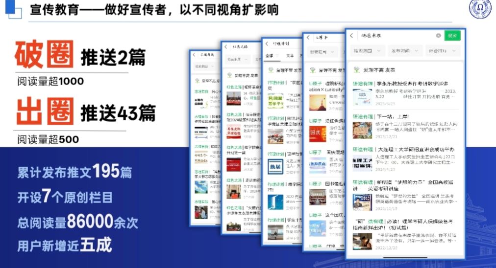 2024年,买球体育官方网站学生会在公众号“爱理不离”累积发布推文195篇、开设7个原创栏目、总阅读量86000余次、用户新增近五成。平台也在不断完善“理院小管家”模块,从同学们关心的学业、生活、情感等方面入手,推出“不挂科”等全新板块,有规划、有准备地开展宣传工作,提高针对性和有效性。