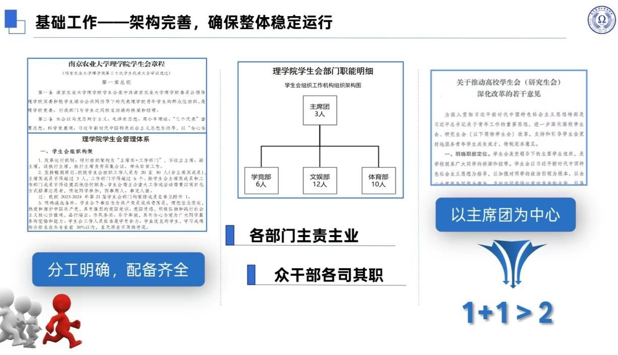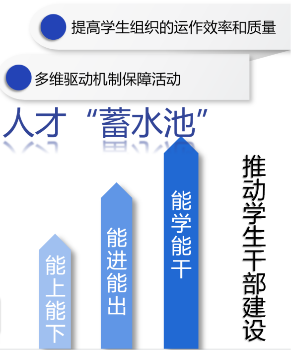 拥有完备的学生会章程,自上而下拥有详细合理的考核制度。主席团每周与负责老师开展主席团例会,每双周与下设部门开展工作总结例会。此外老师贴心经验分享,前辈开课技能指导,多维驱动机制保障运行。