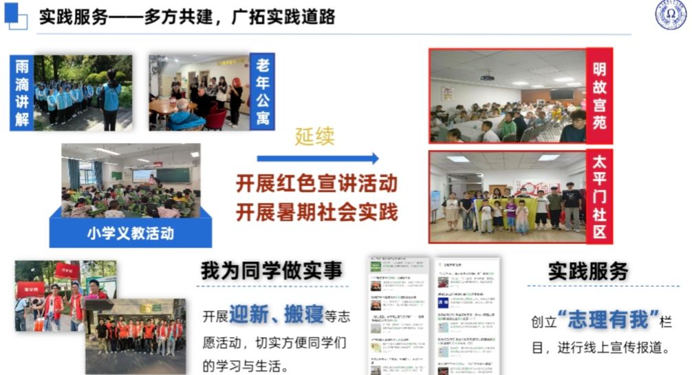 学生会积极宣传本院同学先进志愿事迹。本年度在延续“小雨滴”志愿服务、老年公寓、小学义教的基础上,联合太平门苑社区开展红色文化宣讲活动和少儿科普讲堂活动。买球体育官方网站学生会始终秉持着“全心全意为同学服务”的宗旨,有序开展迎新、搬寝等志愿活动,切实方便同学们的学习与生活,并创立“志理有我”栏目,进行线上时事宣传报道。
