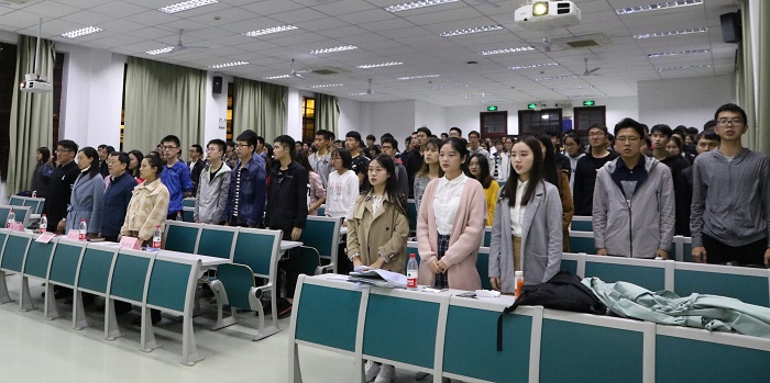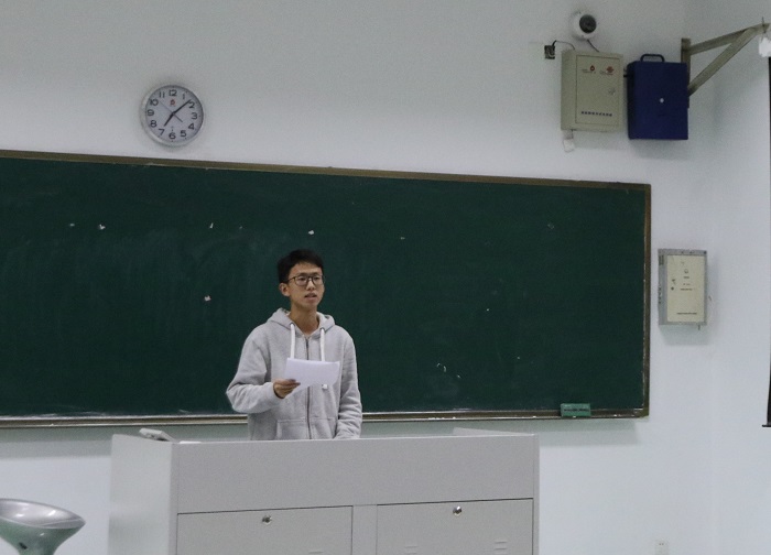 首先,全体起立奏唱了中华人民共和国国歌。礼毕后,三位学生代表上台进行了发言。预备党员代表李歆首先从抗日救国的艰难岁月讲起,回顾了共产党成立初期一批有志青年深入群众,领导中国人民走向光明的历史。这些红色记忆,启迪激励着当代青年践行青春责任,更要求新时代大学生以身边优秀的青年为榜样,践行自己的青春理想。