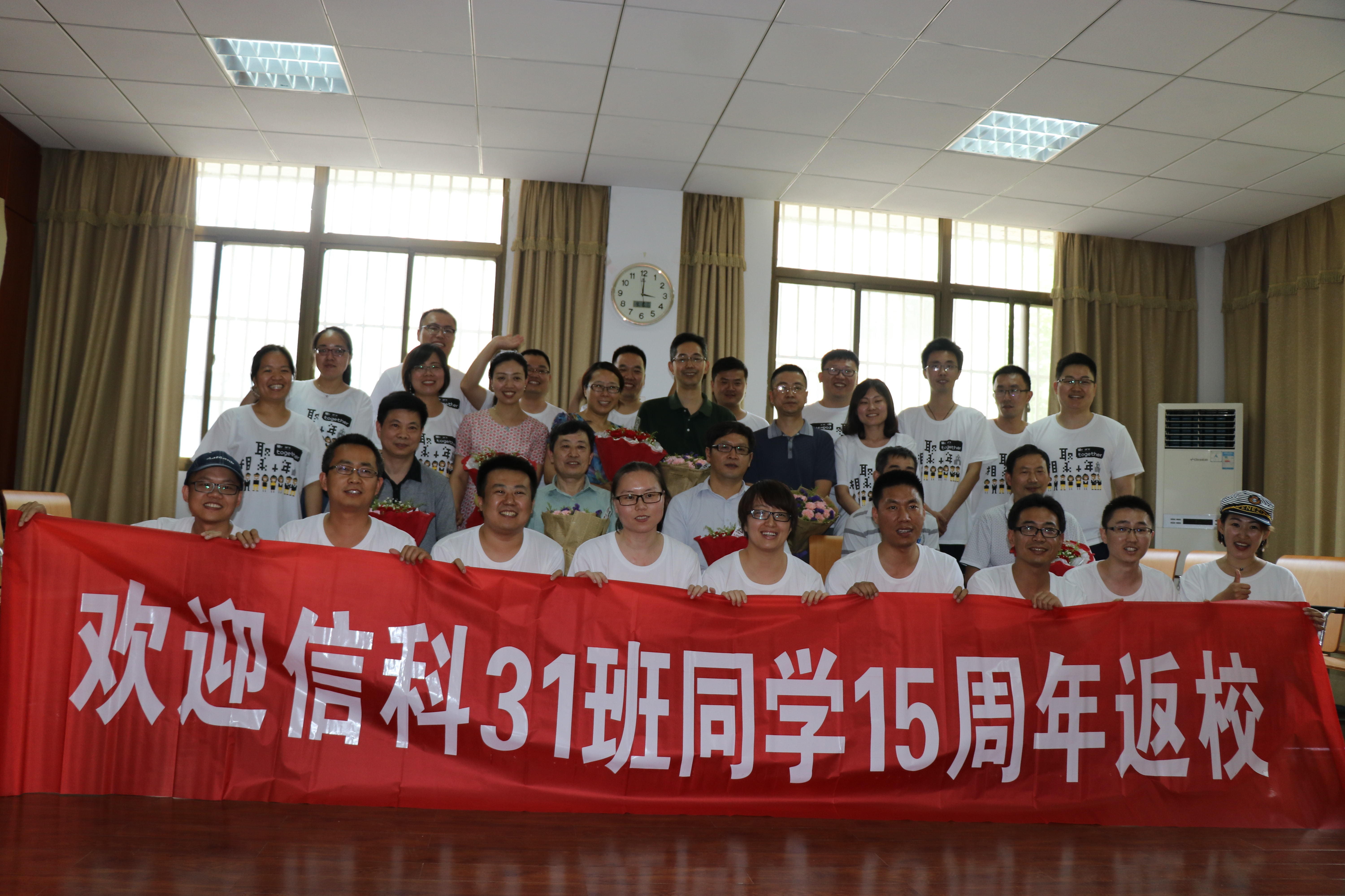 聚会期间,为表感谢之情,同学们为老师送上鲜花,所有老师同学们在感动温馨的氛围下合影留念。聚会最后,信科31班同学依次上台发言。同学们用平凡朴实的话语介绍了这些年自己的工作经历或分享自己幸福的家庭生活等,在欢乐的环境中,同学们开始了学生时代的刺激小游戏――真心话大冒险。通过这个游戏,同学们好像又回到了读书时期,彼此的距离渐渐缩短,眼前仿佛还是那时的你我。