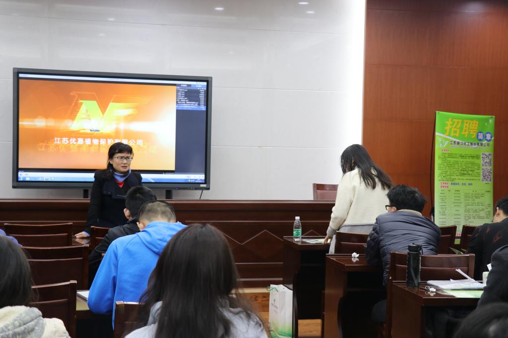 2017年11月27日下午,江苏扬农化工股份有限公司在买球体育官方网站报告厅进行招聘宣讲,公司人事部主任张瑜蓉老师、学院党委副书记刘照云老师以及化学、植保等校内各对口专业感兴趣的学生参加了此次活动。