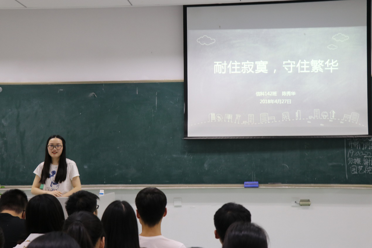 第二位分享的同样是来自信科142班的陈秀华。她通过分享自己从面试频频被刷到院学生会主席的经历,从成绩在班级中下游到成功保研过程中的改变,告诉大家,想改变,就立即付出行动,要行动才能够在过程里感知变化。也只有自己可以改变自己,决定自己的人生。
