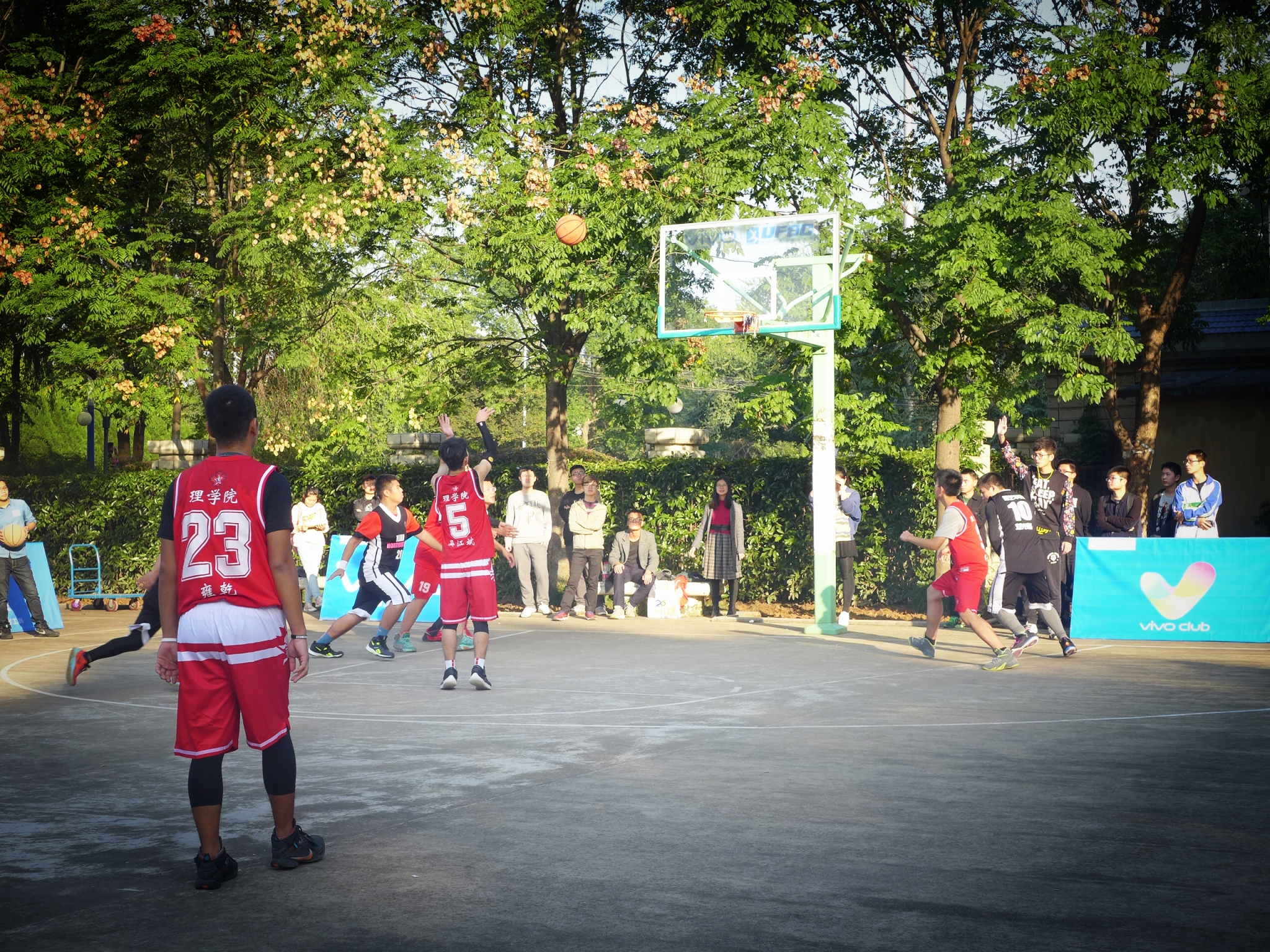 开赛前,篮球场周围早已围满前来观赛助威的同学,所有人都在拭目以待。随着裁判的一声哨响,比赛正式开始!买球体育官网男篮队员一开始没有进入最佳状态,暂时被园艺院领先4分,但教练们对战略进行调整后,买球体育官网队员们纷纷打起精神,连连得分,尤其是买球体育官网队员5号吴江斌同学!接球,运球,一个跳跃,投了一个精彩的二分球,让全场观众不断叫好!买球体育官网12号球员王绍同学也突破园艺院的重重包围,成功进了一个2分球。