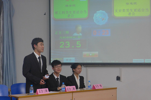 本次比赛就“理工科类男生还是文史类男生更适合当老公”这一辩题展开了激烈的辩论,买球体育官网作为正方的辩题是“理工科类的男生更适合当老公”。学院大二的周婧芸同学、大一的李帅、冀昊琰同学分别担任本次比赛的一辩二辩三辩。一辩陈词中双方都各自陈述了自己的观点,在接下来的二辩对辩、自由辩论环节,双方就“文理科生哪个更容易维持婚姻稳定”、“哪个更专一”、“哪个薪水更高”等主要分论点展开了激烈的辩论。双方均有理有据,场面十分激烈,赢得了观众的阵阵掌声。最终,买球体育官网选手凭借敏捷的思维和出色的口才,以32票比6票的得分战胜了信息院。